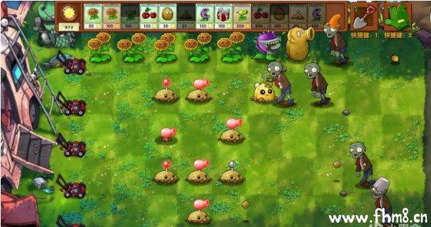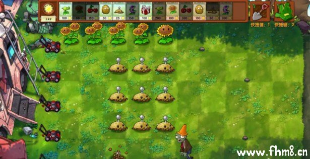 2、使用高于向日葵高度的坚果保护一路,其他路可以都种上“豌豆土豆雷”和“豌豆坚果墙”。